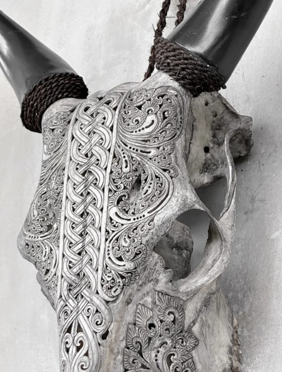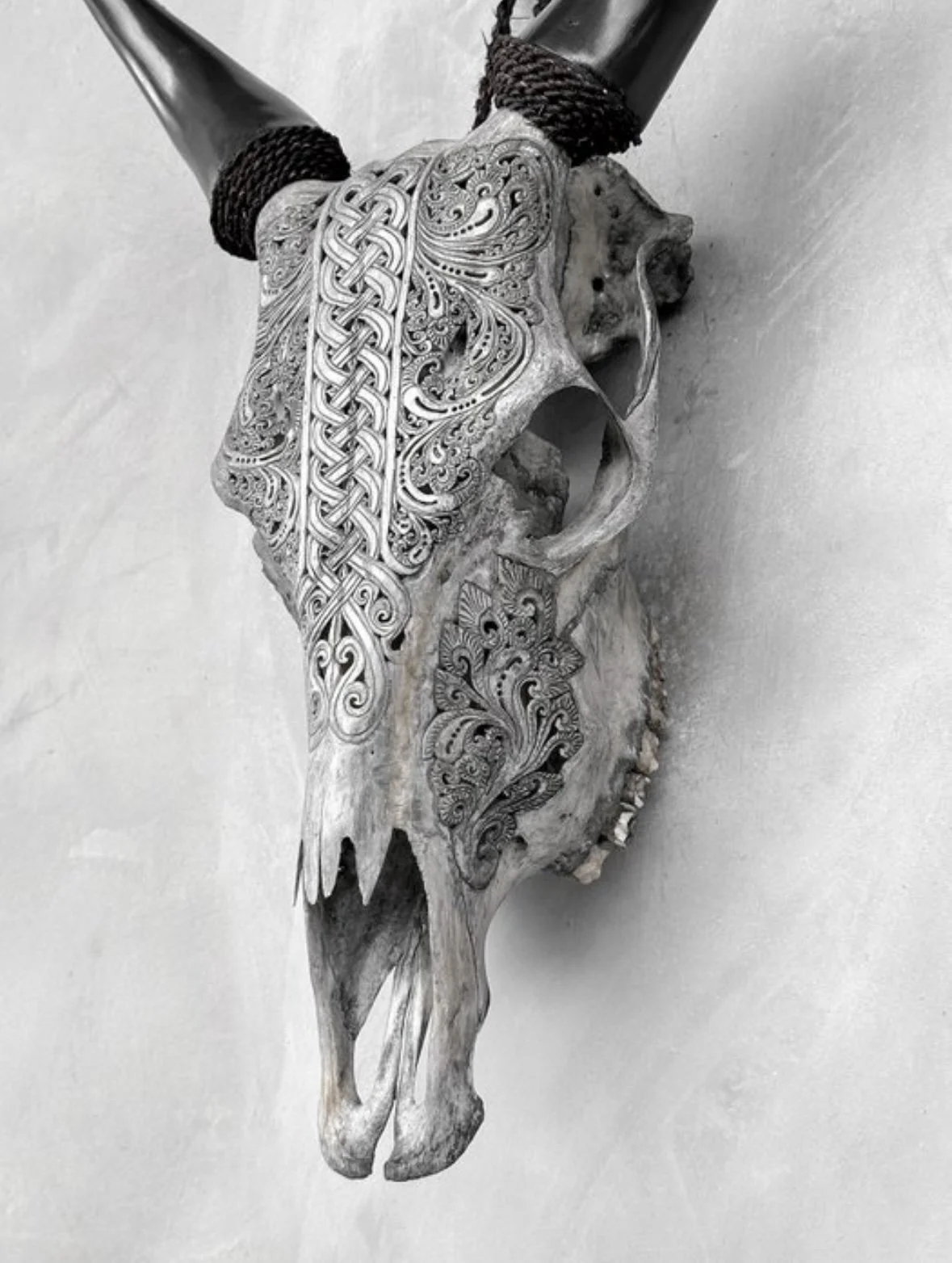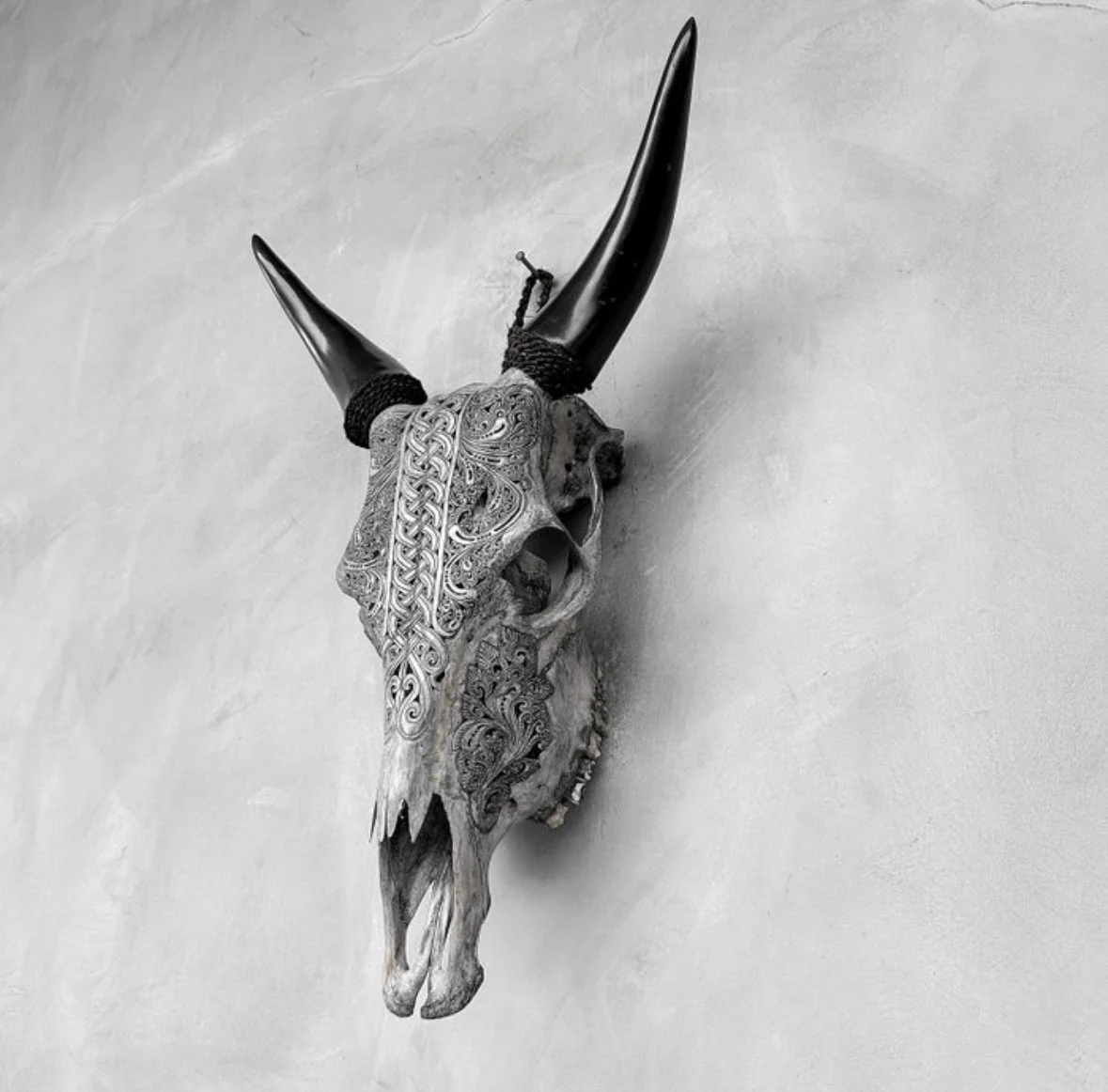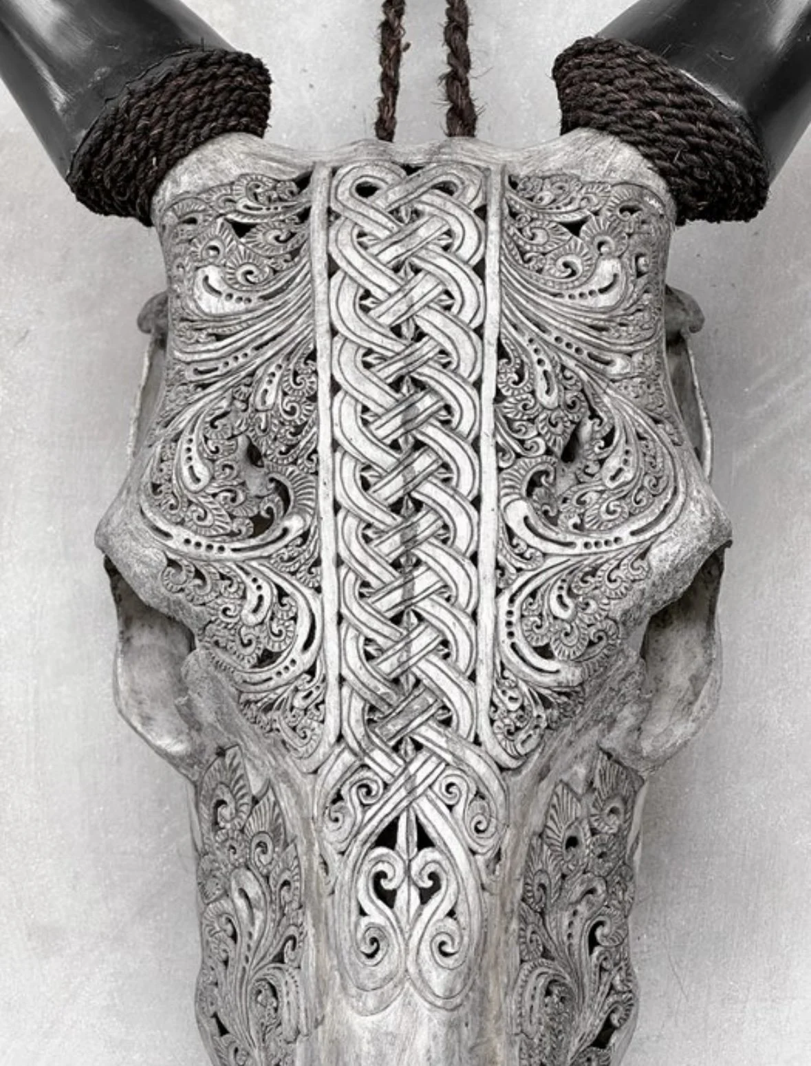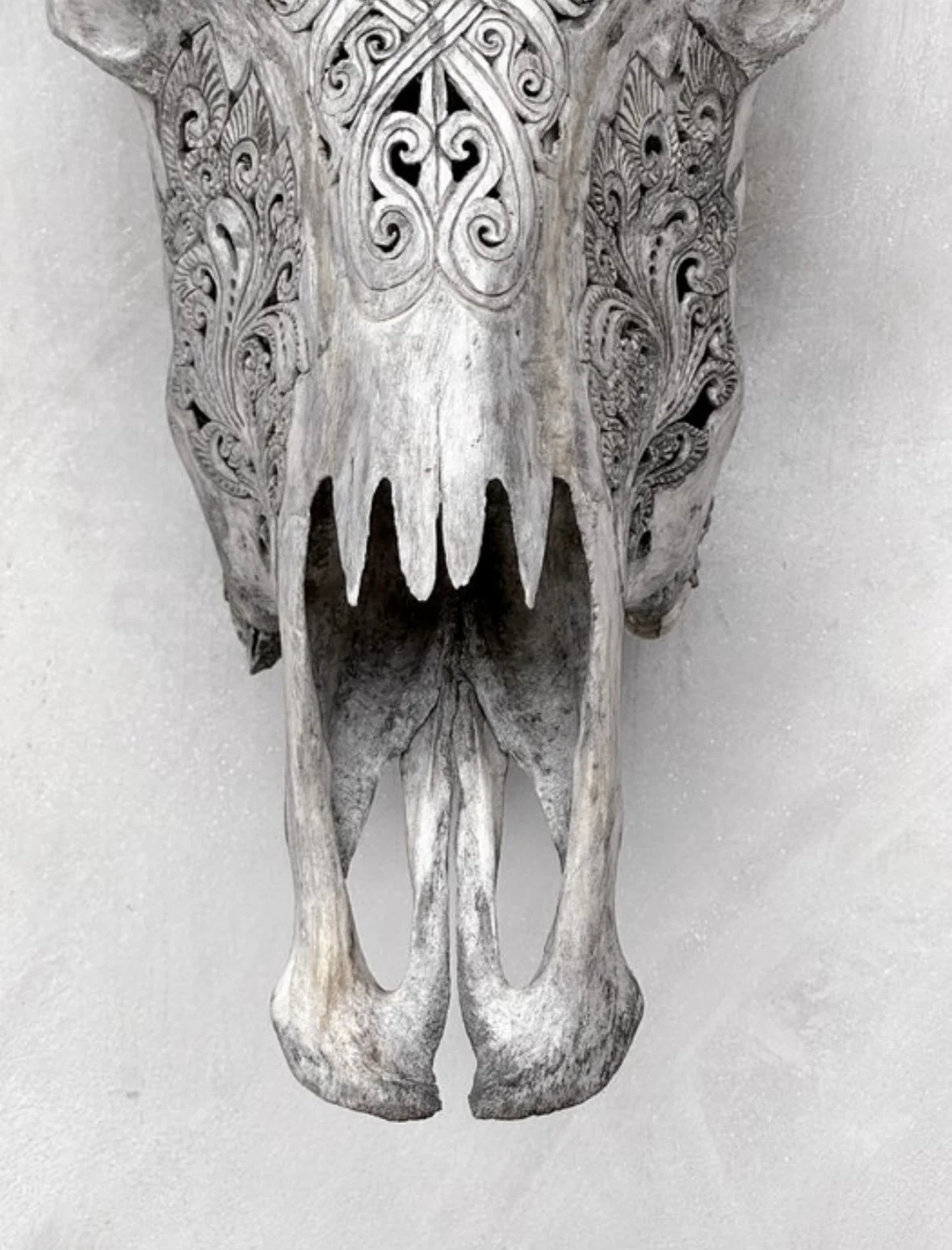 Categories: All Statuettes Handcarved Skulls Free-standing Decors Ceiling Decors Serving Boards Design Vessels Coffee Tables Wall Decors All / Handcarved Skulls All Statuettes Handcarved Skulls Free-standing Decors Ceiling Decors Serving Boards Design Vessels Coffee Tables Wall Decors Hand-carved cow skull - tree of life motif €200.00 Add To Cart Added! Hand-carved black bull skull - Infinity motif €240.00 Add To Cart Added! Hand-carved black goat skull with carved horn - Traditional Balinese motif €140.00 Add To Cart Added! Hand-carved black cow skull - Fern motif €180.00 Sold out Sold Out Added! Hand-carved grey cow skull with carved horns - Flower of Life Motif €200.00 Add To Cart Added! Hand-carved grey cow skull - Infinity motif €180.00 Add To Cart Added! Authentic Cow Skull with Glass Mosaic Inlay Sale Price: €180.00 Original Price: €240.00 Sale Add To Cart Added!