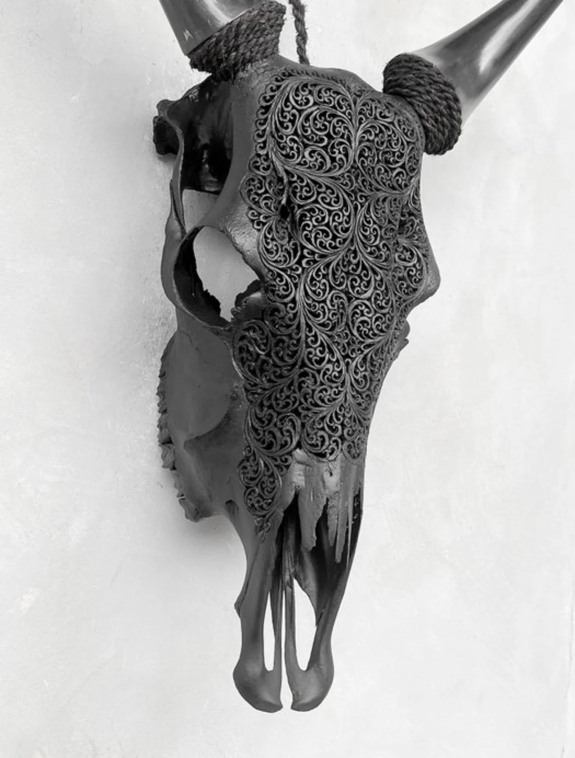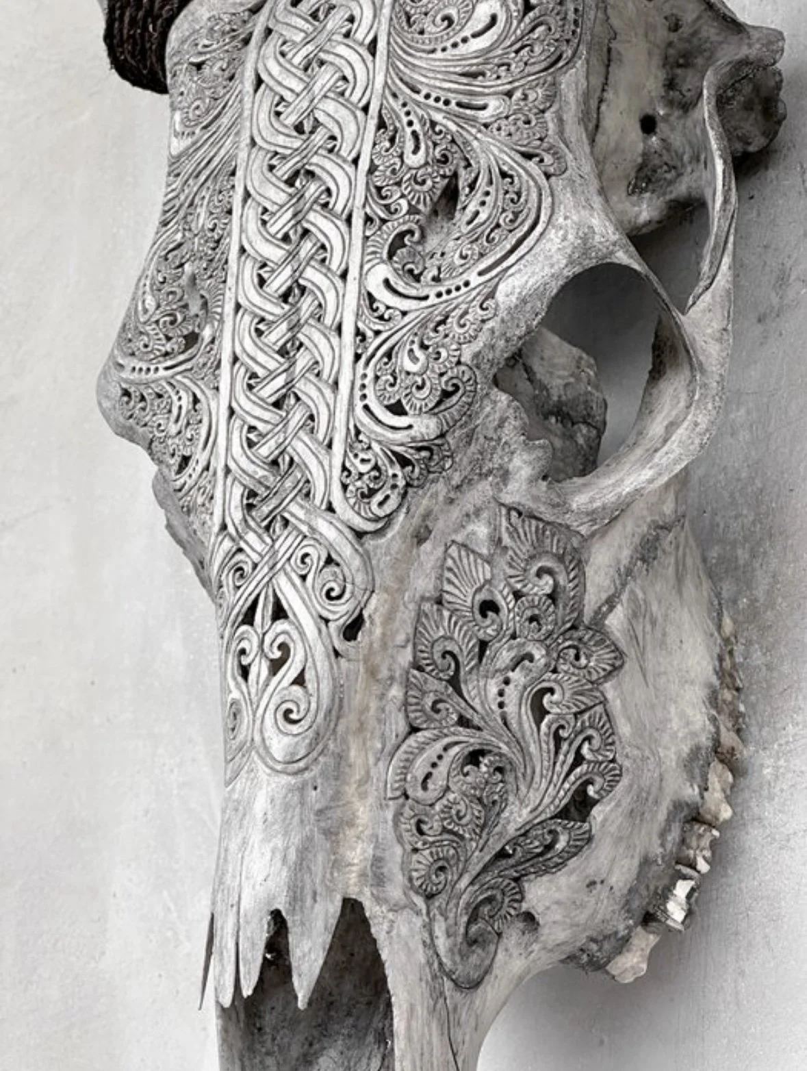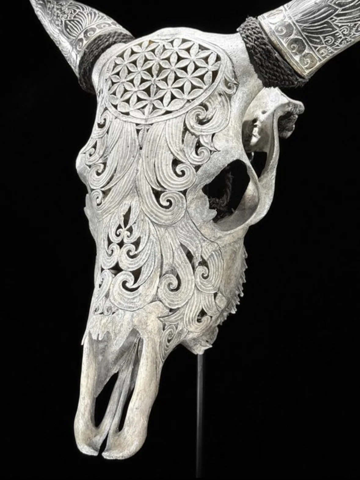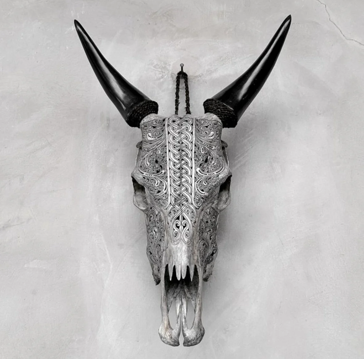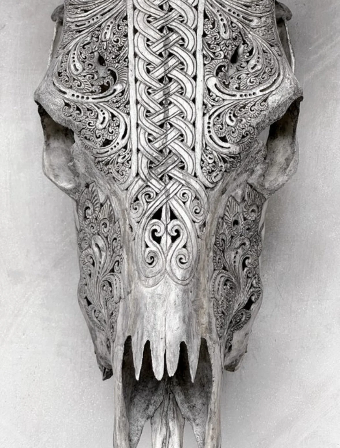Categories: All Statuettes Handcarved Skulls Free-standing Decors Ceiling Decors Serving Boards Design Vessels Coffee Tables Wall Decors All / Handcarved Skulls All Statuettes Handcarved Skulls Free-standing Decors Ceiling Decors Serving Boards Design Vessels Coffee Tables Wall Decors Hand-carved cow skull - tree of life motif €200.00 Add To Cart Added! Hand-carved black bull skull - Infinity motif €240.00 Add To Cart Added! Hand-carved black goat skull with carved horn - Traditional Balinese motif €140.00 Add To Cart Added! Hand-carved black cow skull - Fern motif €180.00 Sold out Sold Out Added! Hand-carved grey cow skull with carved horns - Flower of Life Motif €200.00 Add To Cart Added! Hand-carved grey cow skull - Infinity motif €180.00 Add To Cart Added! Authentic Cow Skull with Glass Mosaic Inlay Sale Price: €180.00 Original Price: €240.00 Sale Add To Cart Added!
